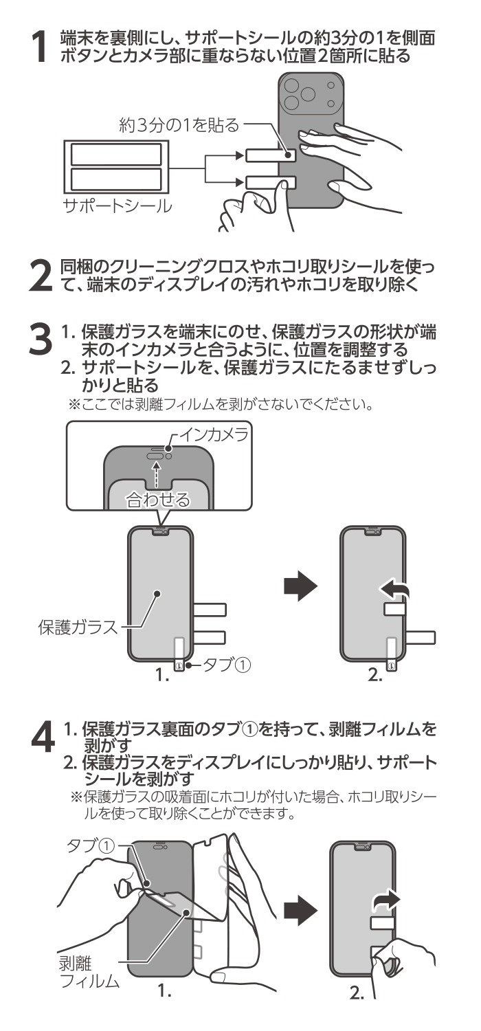 | 製品構成 | 保護ガラス ×1、クリーニングクロス ×1、ホコリ取りシール ×1、サポートシール ×2、取扱説明書/保証書×1 |