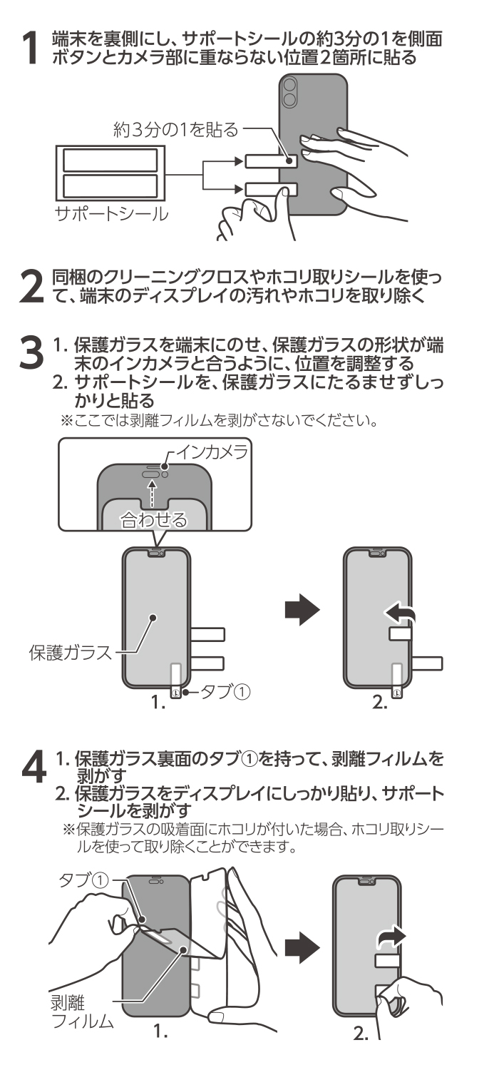 製品構成保護ガラス ×1、クリーニングクロス ×1、ホコリ取りシール ×1、サポートシール ×2、取扱説明書/保証書×1