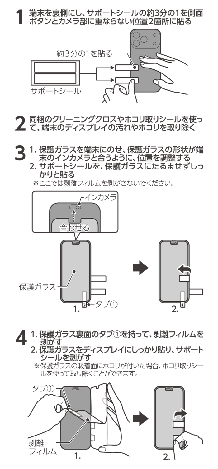製品構成保護ガラス ×1、クリーニングクロス ×1、ホコリ取りシール ×1、サポートシール ×2、取扱説明書/保証書×1