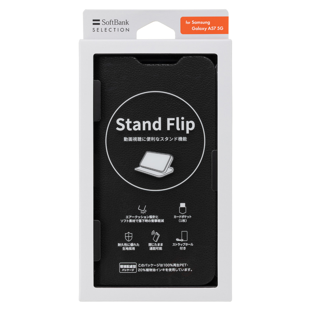 ソフトバンクセレクション ギャラクシーA57 5G 専用ケース スマホケース 手帳型カバー フリップケース 横置きスタンド 動画視聴 ストラップホール付き カード収納 フラットポケット マグネット フロントカバー 画面保護 エアクッション構造 衝撃吸収 シンプルデザイン ビジネス レディース メンズ ブラック 合皮 SB-A114-SDFB/BK