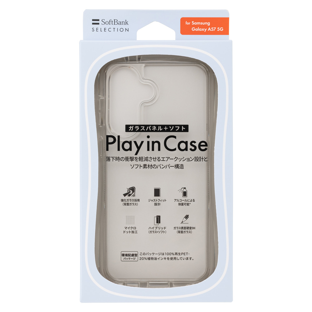 ソフトバンクセレクション ギャラクシーA57 5G 専用ケース クリアカバー バンパーケース ソフトフレーム 背面ガラス 強化ガラス 透明度 高い カスタマイズ ケース内封入 写真カード対応 厚み0.4mm以下推奨 衝撃吸収 クッション構造 四隅保護 ハイブリッド構造 マイクロドット加工 黄ばみ防止 アルコール除菌対応 ジャストフィット設計 シンプル デザイン SB-A114-HYAH/CL