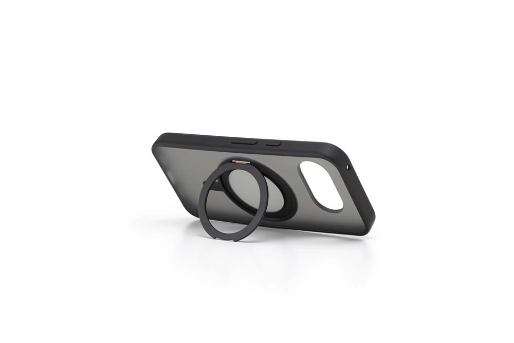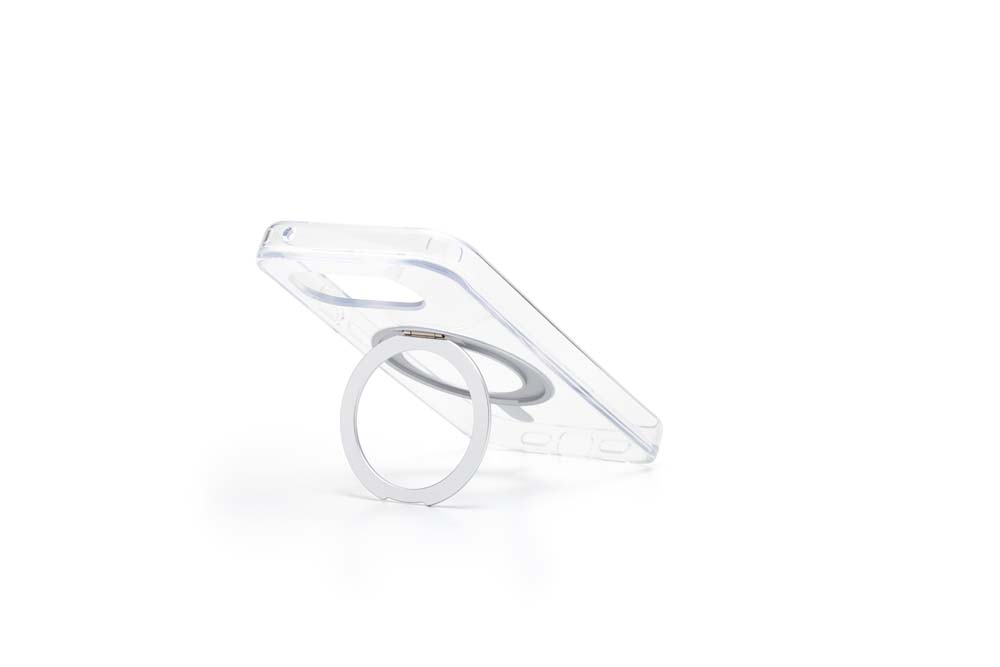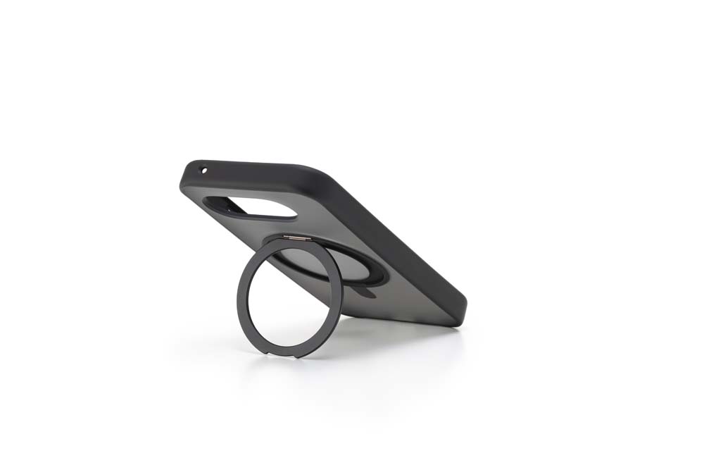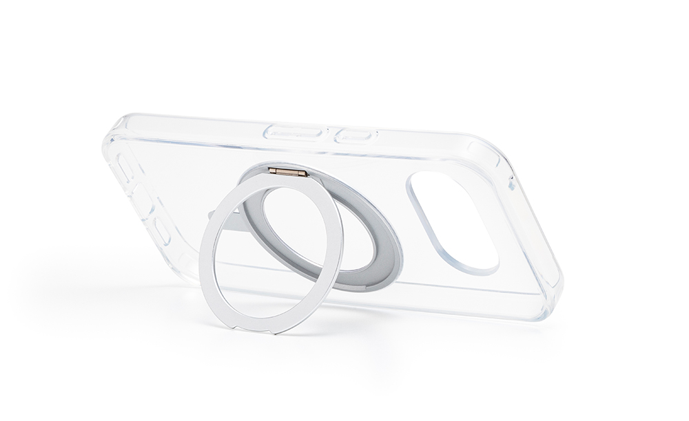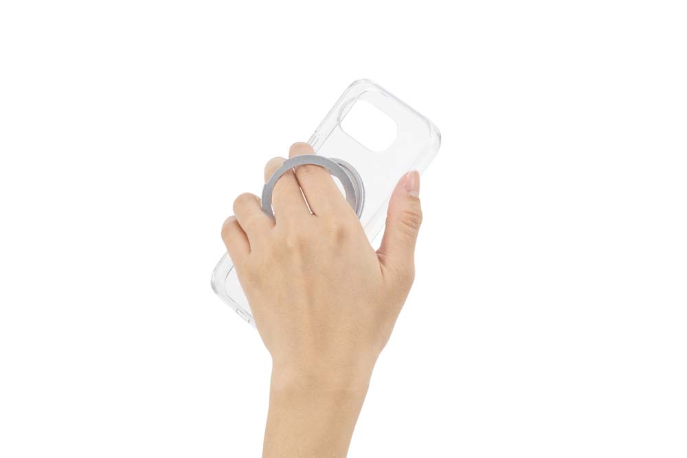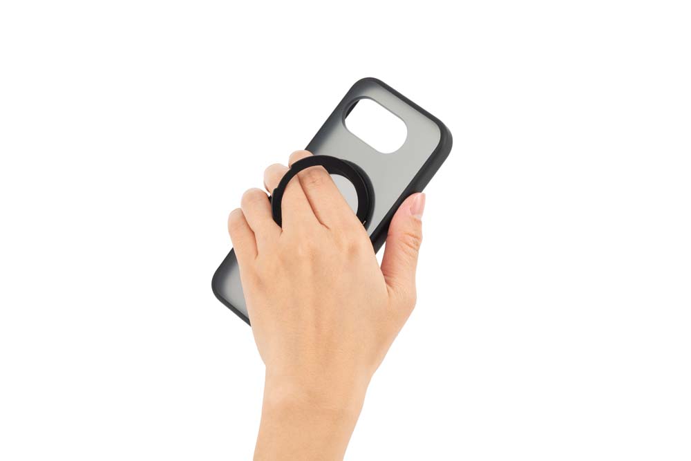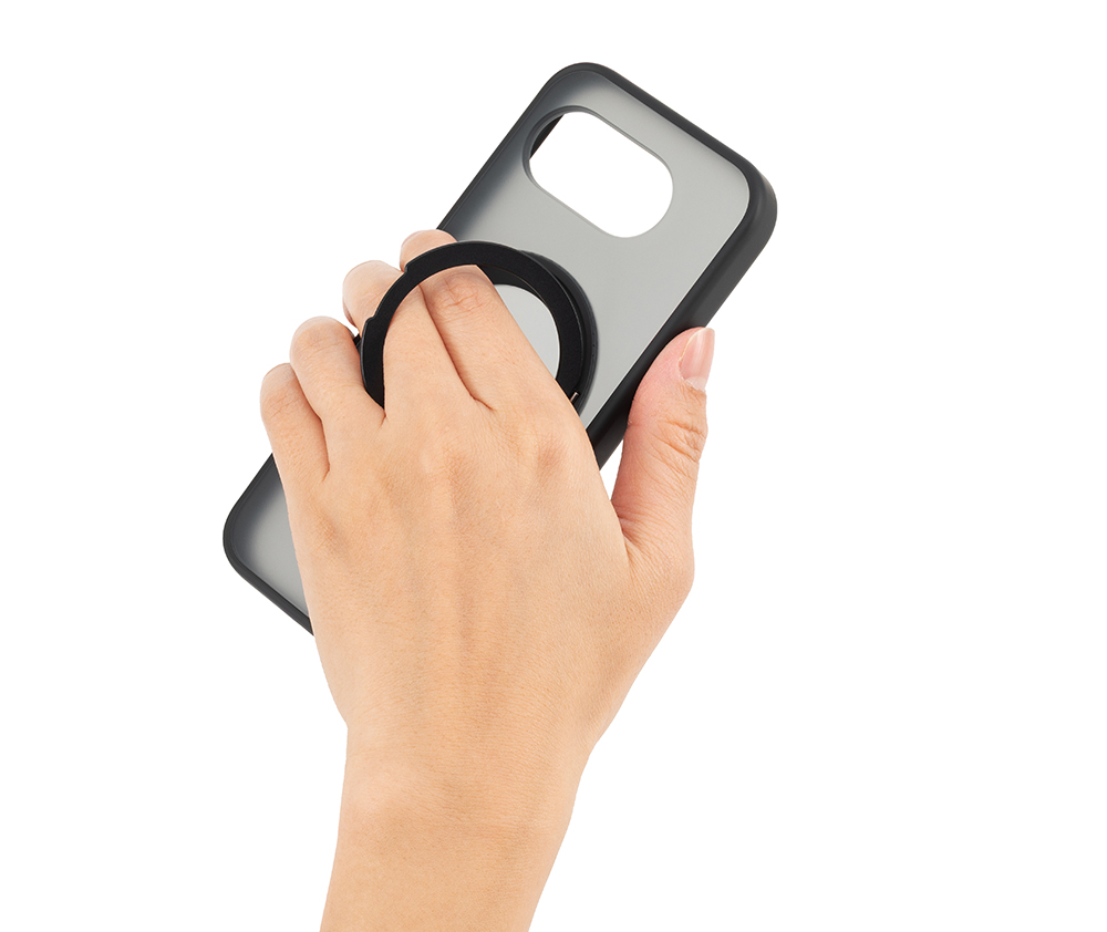 リングは360°回転し、自由に角度調整が可能。リングに指を通すことで端末の落下を防ぎ、安定した操作を実現