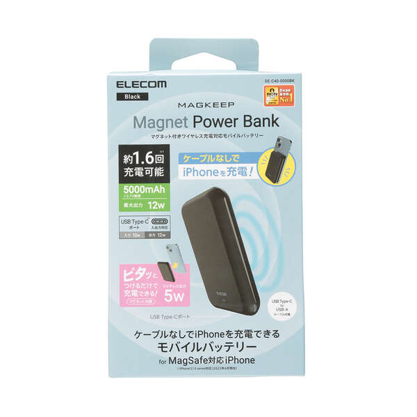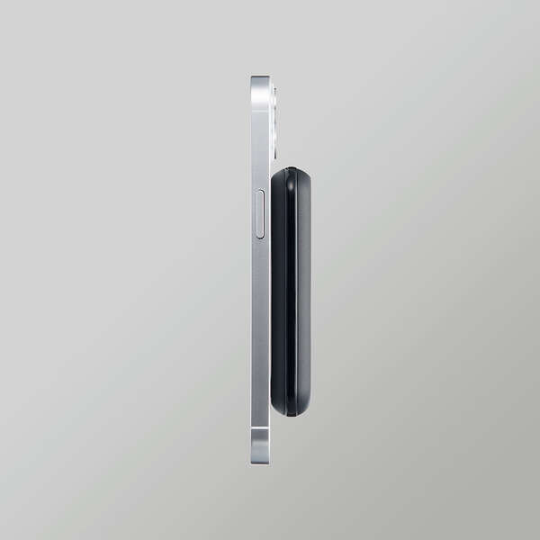 MagSafe対応iPhoneにマグネットで取り付け、5Wでワイヤレス充電できるモバイルバッテリーです。