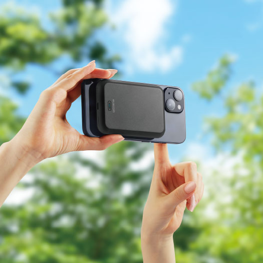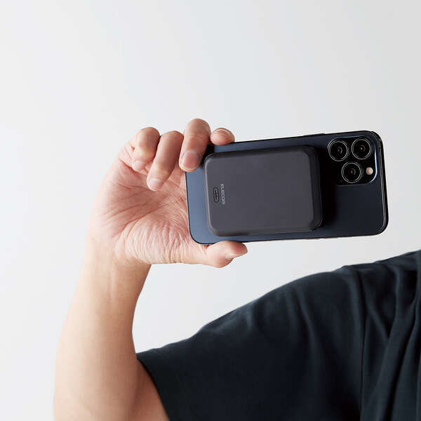 MagSafe対応iPhoneシリーズをマグネットで取り付け、5Wのワイヤレス充電ができるモバイルバッテリーです。また、モバイルバッテリーとiPhoneを同時に充電できるので、本製品を電源に接続しワイヤレス充電器としても使用することができます。コンパクトなデザインでiPhoneの背面レンズに干渉しないので安心してお使いいただけます。