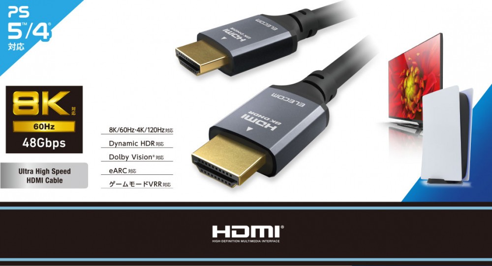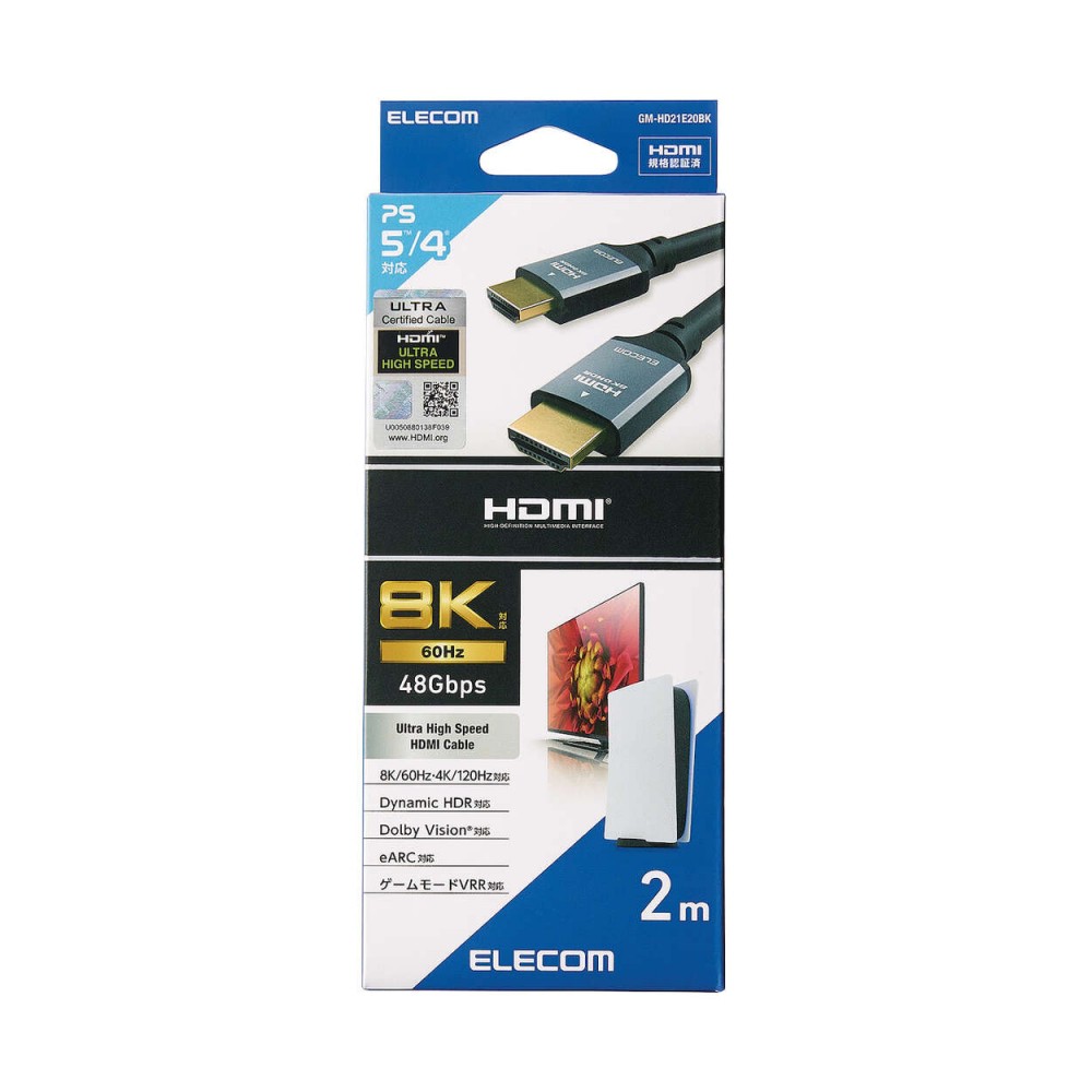 最大8K/60Hzの解像度に対応した、認証済みのウルトラハイスピードHDMIケーブルです。HDMI出力端子を搭載したゲーム機などの接続におすすめです。