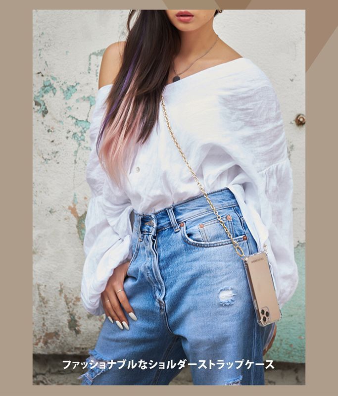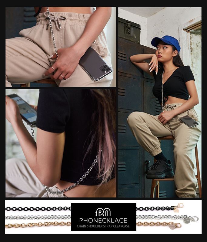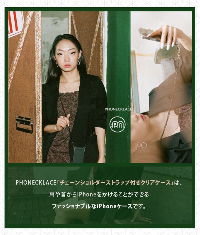 PHONECKLACE「チェーンショルダーストラップ付きクリアケース」は、肩や首からiPhoneをかけることができるファッショナブルなiPhoneケースです。リング型のロゴ入りチャームがおしゃれ。