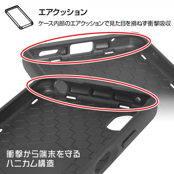 衝撃をやわらげるTPU×鉛筆硬度3Hで傷に強いポリカーボネイト。ケース上部と下部は衝撃をやわらげるエアクッション構造。ケース内側は衝撃から端末を守るハニカム構造。液晶を下向きに置いても傷が付きにくい。