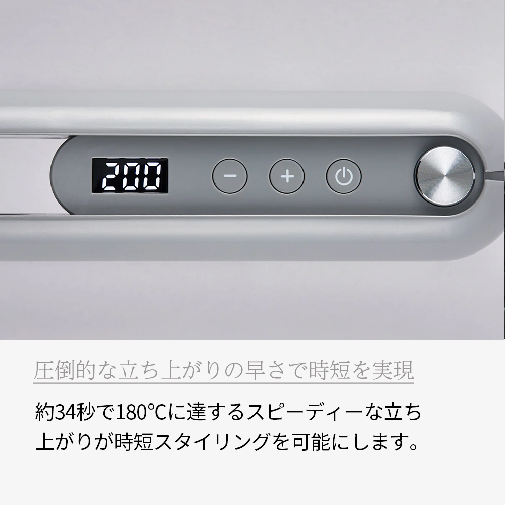 独自に開発したデジタル制御と温度センサーによるハイブリッド制御方式により、約34秒で180°Cに達するスピーディーな立ち上がりが時短スタイリングを可能にします。精密な温度コントロールを実現するとともに、ハイレスポンスヒーターとの組合せにより業界最高レベルの熱応答性を実現しました。施術効率を高めるだけでなく、急激な温度変化に伴う髪へのダメージを軽減します。
