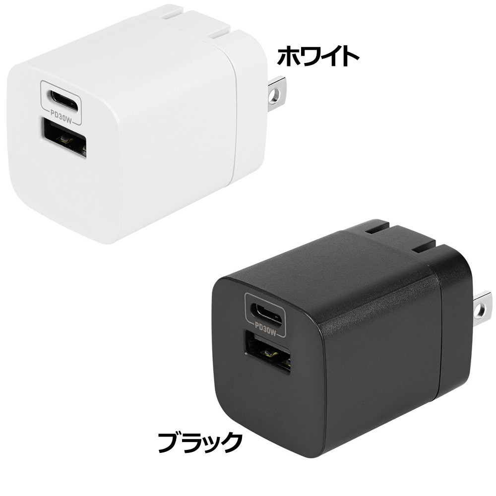 GaNを採用した本製品は、スマートフォンなどの対応機器に最大30Wでの充電が可能なAC充電器です。USB Type-CポートとUSB Type-Aポートをそれぞれ1基搭載しているため、2台同時充電が可能です。
