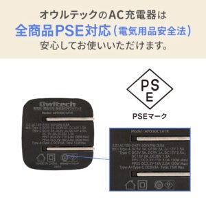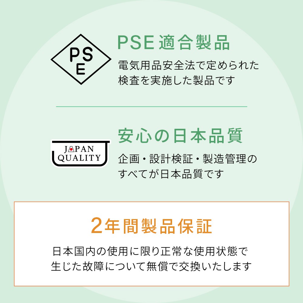 日本の法律である「電気用品安全法」で定められた検査を実施したPSE適合製品です。安心・安全にご利用いただけます。