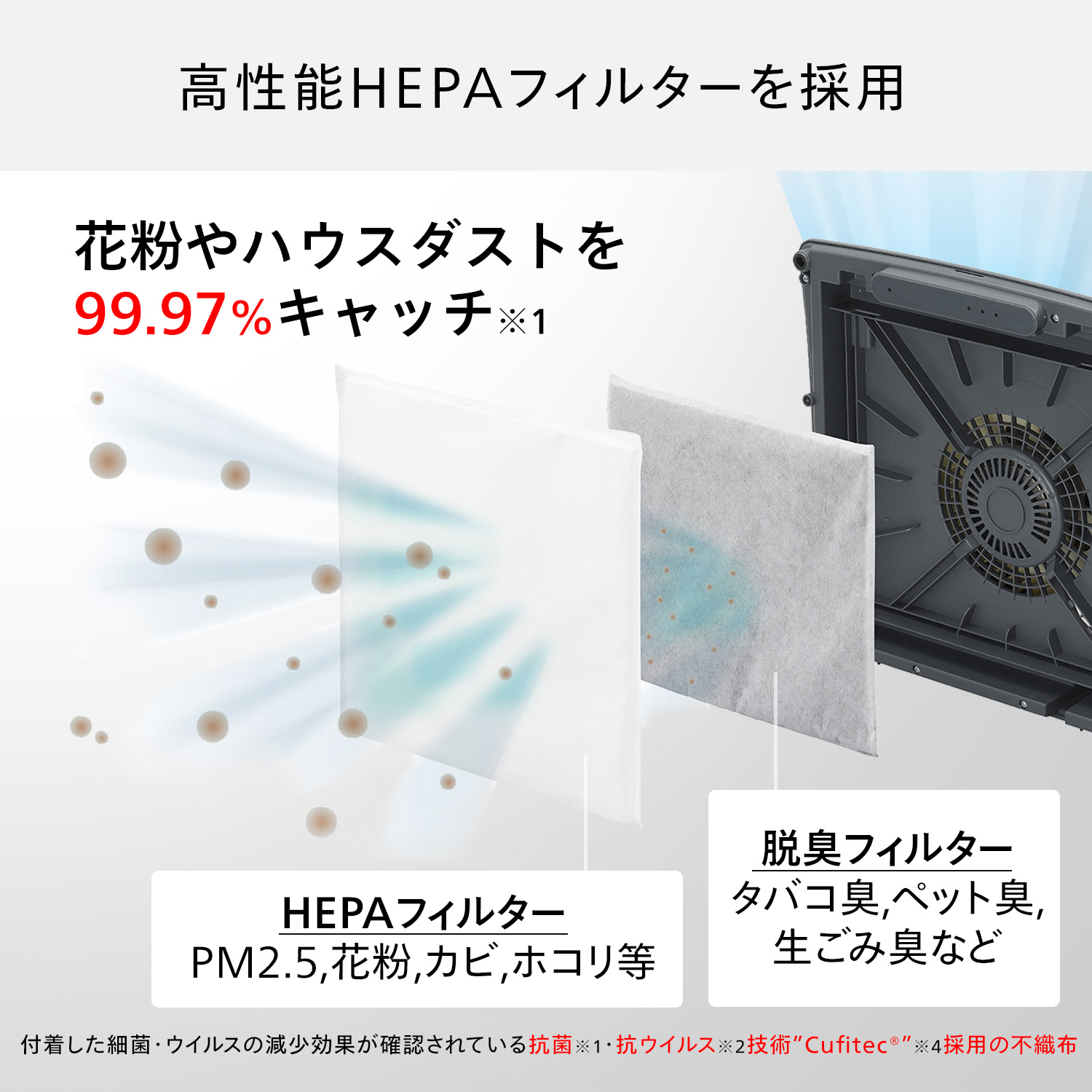 HEPAフィルターは花粉やハウスダストなどの0.3の微細な粒子を99.97%※3捕集し、除去。さらにフィルターをプリーツ状にすることで集じん面積を増加。目詰まりによる能力低下を防ぎ、集じん効果が持続※4します。